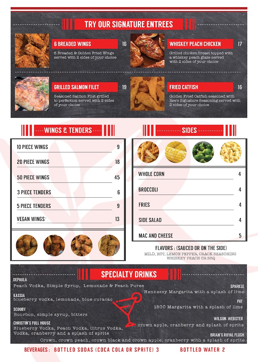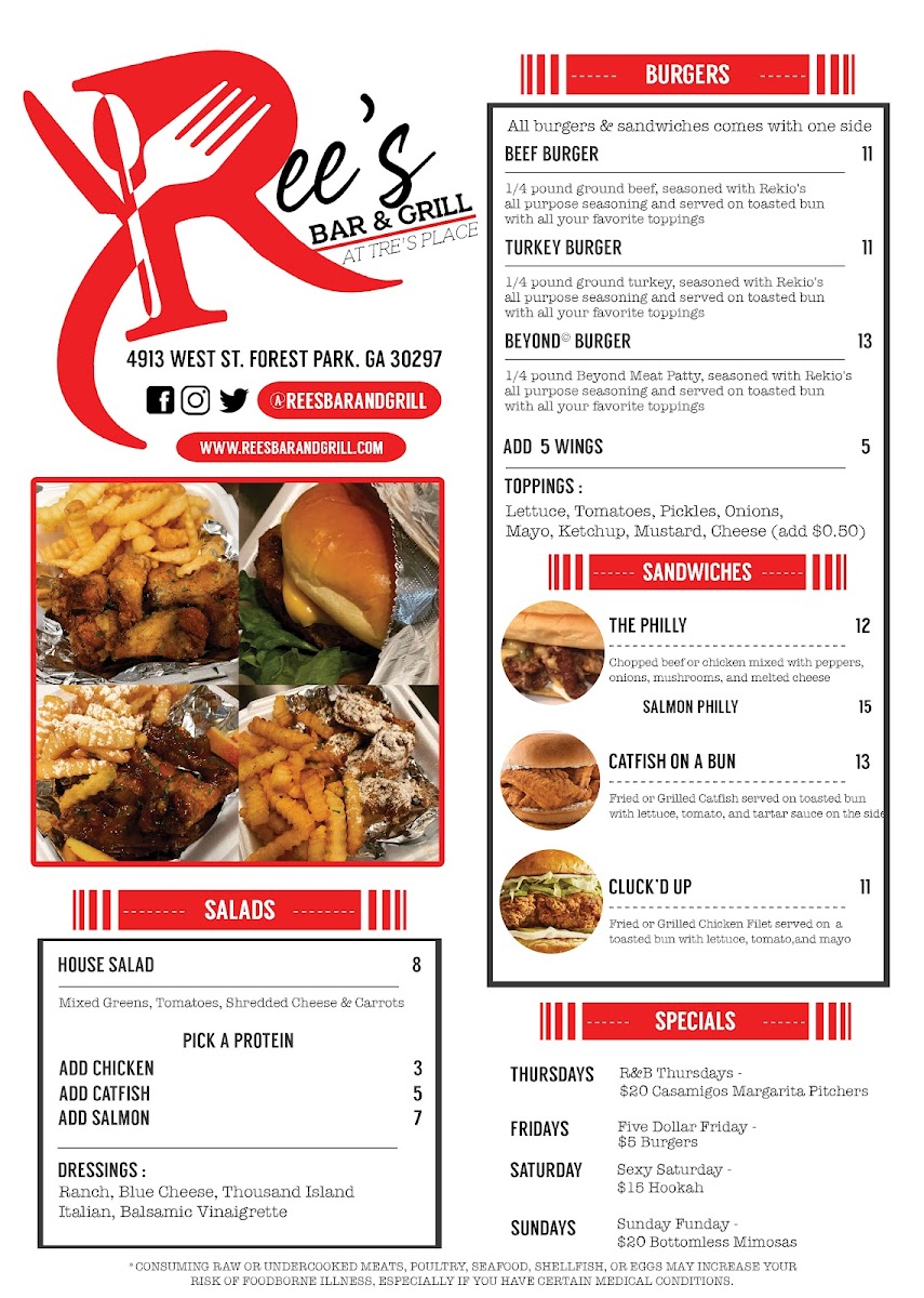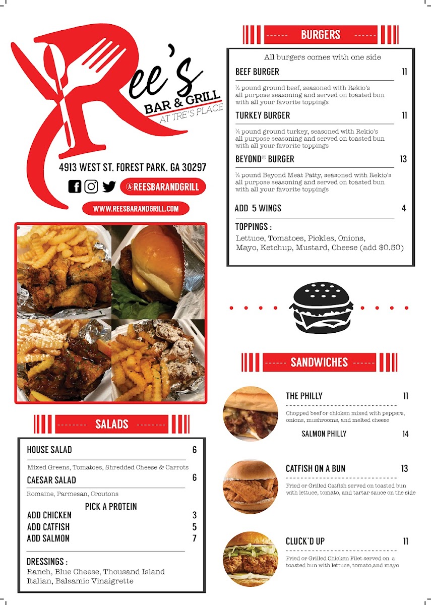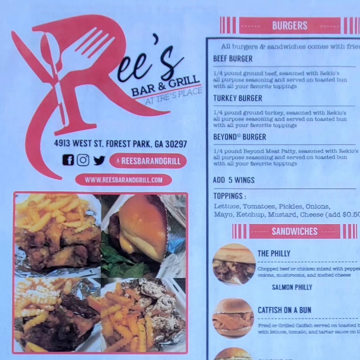 Located in the heart of Forest Park, Georgia, Ree's Bar & Grill offers a casual and welcoming atmosphere that’s perfect for any occasion. Whether you're dropping by for a quick bite or settling in for a relaxing meal, the Ree's Bar & Grill Menu has something to satisfy everyone. From juicy burgers to crispy wings, their diverse menu is packed with mouthwatering options. For those in the mood for comfort food, the grilled sandwiches and hearty platters are a must-try. If you're after something lighter, the fresh salads and flavorful appetizers are great choices to kick off your meal. Each dish is crafted with care, using high-quality ingredients that ensure every bite is delicious. The laid-back vibe and friendly service make it a great spot to enjoy a hearty meal, unwind, and spend time with friends or family.